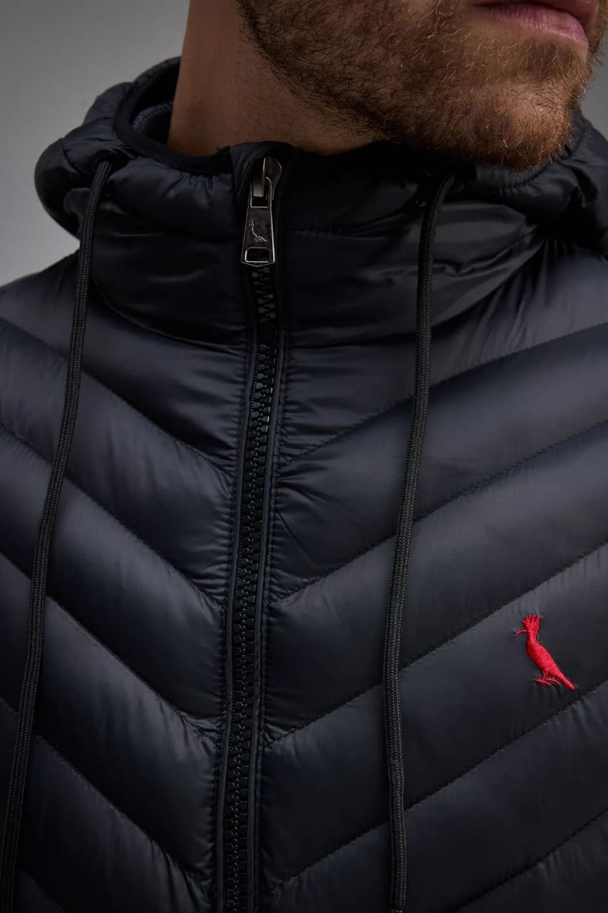 Sua construção anatômica foi pensada nos mínimos detalhes: os recortes no peitoral valorizam a postura, os recortes na cintura deixam a silhueta mais ajustada e o recorte nas costas evita o visual arredondado comum em puffers tradicionais — garantindo um caimento mais alinhado ao corpo e uma aparência mais composta.